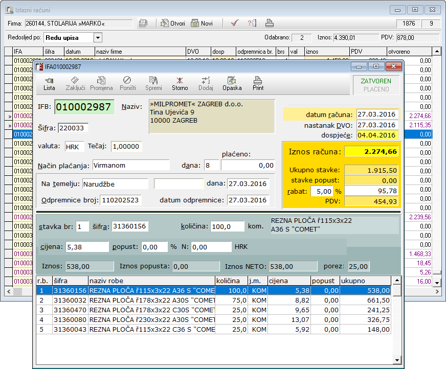 Fakturiranje je moguće direktno iz odpremnice čime, osim što štedite vrijeme na prepisivanje, također izbjegavate mogućnost pogreške. Neće vam se više dešavati da je nešto odpremljeno, a sasvim nešto drugo fakturirano. Osim iz odpremnice račun se može kreirati i direktnim unosom na sličan način kao i odpremnica. Devizne fakture, dakle u drugačijoj valuti od domicilne se rade na jednako jednostavan način. Svi iznosi se iskazuju u valuti fakturiranja, a ispis je u prilagođenom formatu. Kako svakom kupcu definirate obračunsku valutu, tako se prema tome automatski odabire i valuta fakturiranja. Ispis deviznih računa je na engleskom