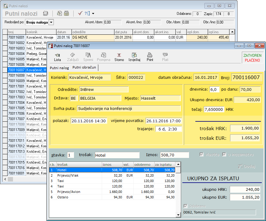 Sada putovanja možete puno lakše planirati kako sebi tako i svojim suradnicima, a obračun troškova je brz, jednostavan i točan. Nakon što ste odobrili troškove putovanja i zaključili dokument, možete zadati automatsko kreiranje naloga za plaćanje.